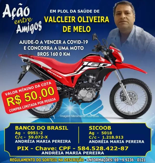 Iago Pereira do Nascimento, filho do diretor do Rádio Planalto de Vilhena, Valcleir Oliveira de Melo, está promovendo uma ação entre amigos, no qual vai sortear uma moto 160 0 Km, para custear as despesas do tratamento de seu pai que está internado numa Unidade de Terapia Intensiva (UTI) na cidade de Cacoal.