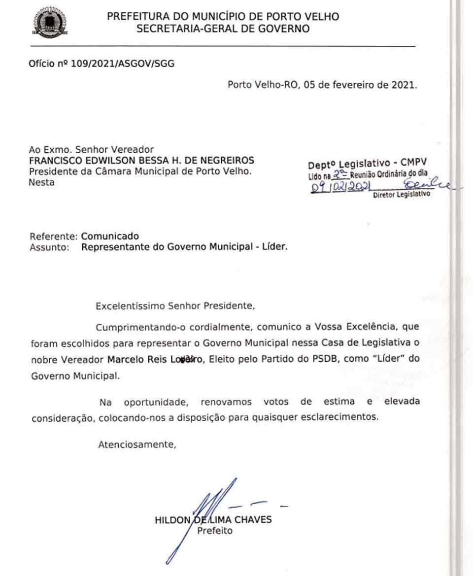 Porto Velho, RO – O prefeito reeleito Hildon Chaves, do PSDB, já comunicou à Câmara de Porto Velho: o novo líder da gestão no Legislativo municipal será Marcelo Reis, também tucano.