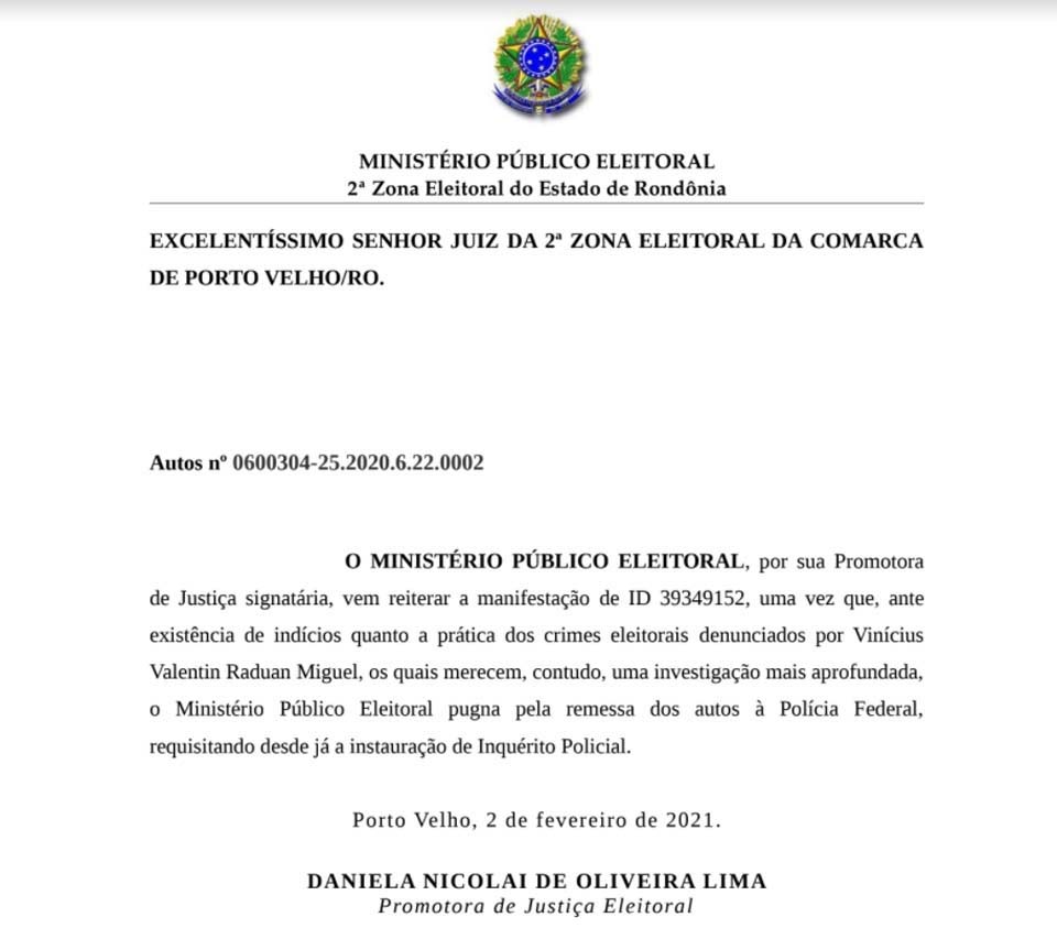 Em trecho do despacho, a representante da instituição de fiscalização e controle menciona a existência de indícios quanto a prática supostos crimes eleitorais, e, portanto, precisam de uma investigação “mais aprofundada”. Por isso, ao fim, Daniela Nicolai solicitou ao Juízo a remessa dos autos a fim de que a Polícia Federal (PF) instaure o devido inquérito.