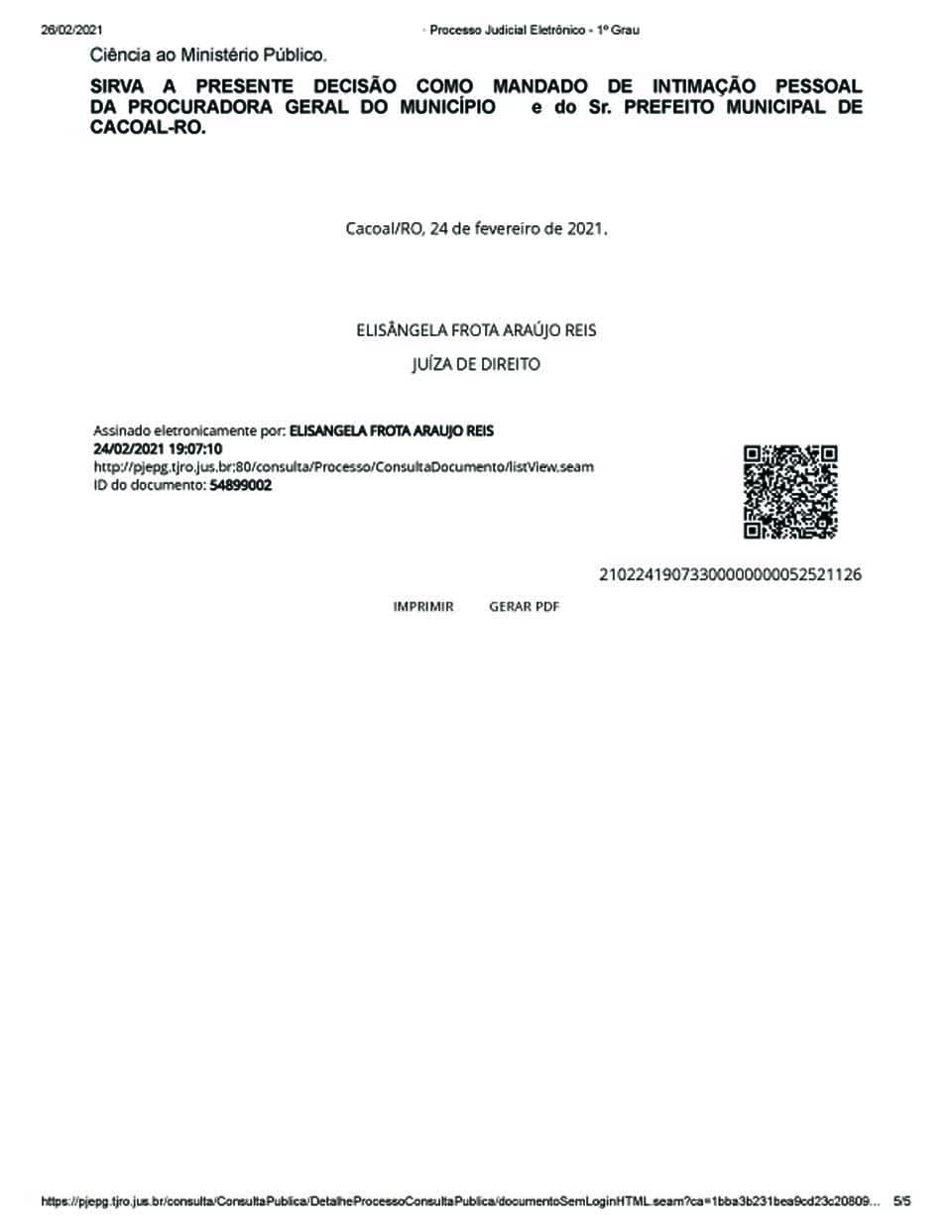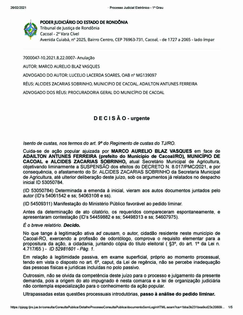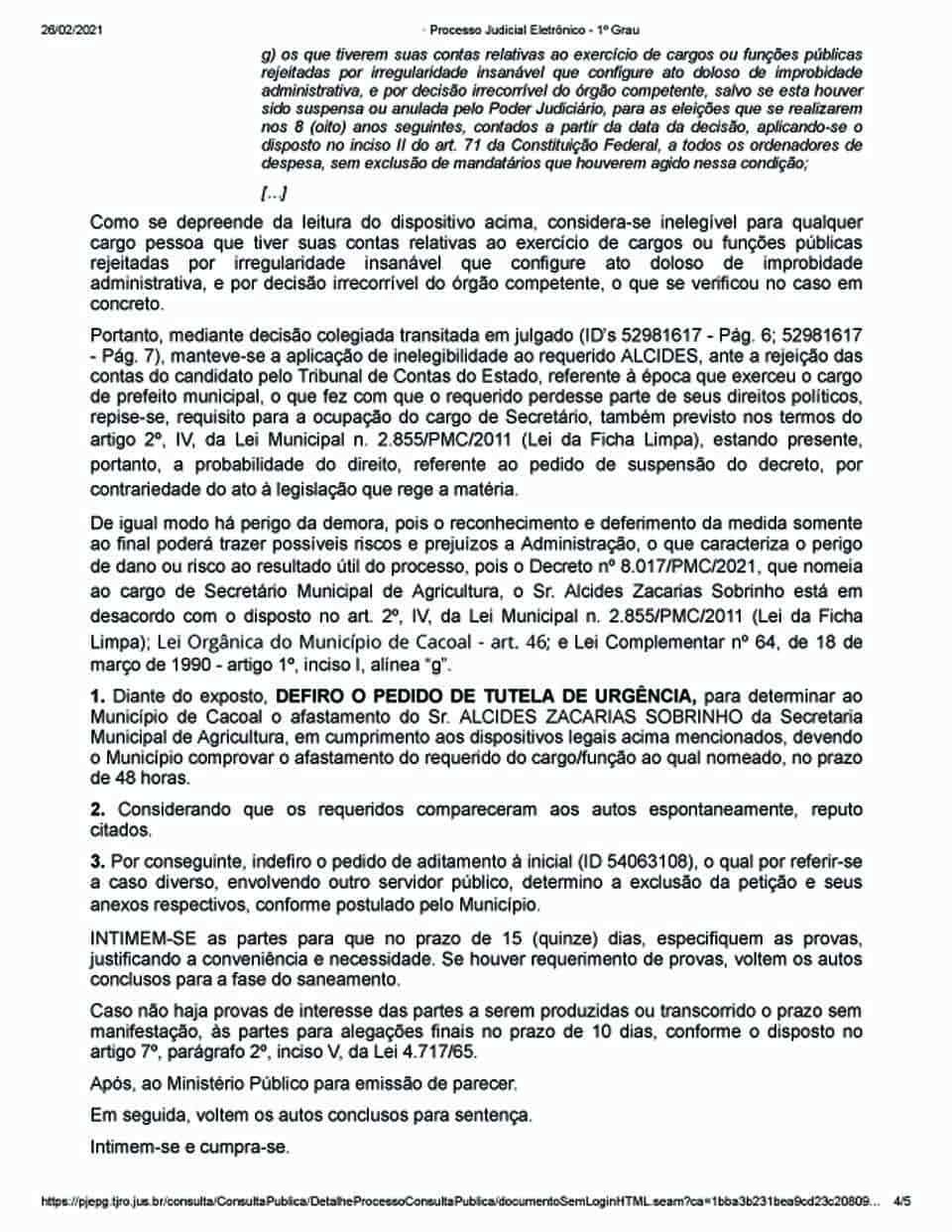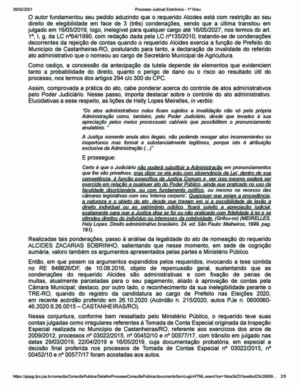 Porto Velho, RO - A Justiça de Rondônia mandou a Prefeitura de Cacoal exonerar o secretário municipal de Agricutura Alcides Zacarias Sobrinho, nomeado pelo atual prefeito Adaílton Antunes Ferreira, o Adaílton Fúria, do PSD. A decisão foi promovida pela juíza de Direito Elisângela Frota Araújo Reis, da 2ª Vara Cível.