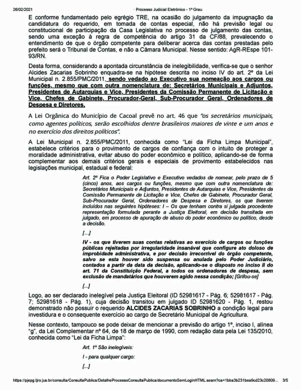 Em suma, Sobrinho não poderia assumir a funçao porque teve as contas julgadas irregulares e isto, por si, resvala na "Lei da Ficha Limpa Municipal".