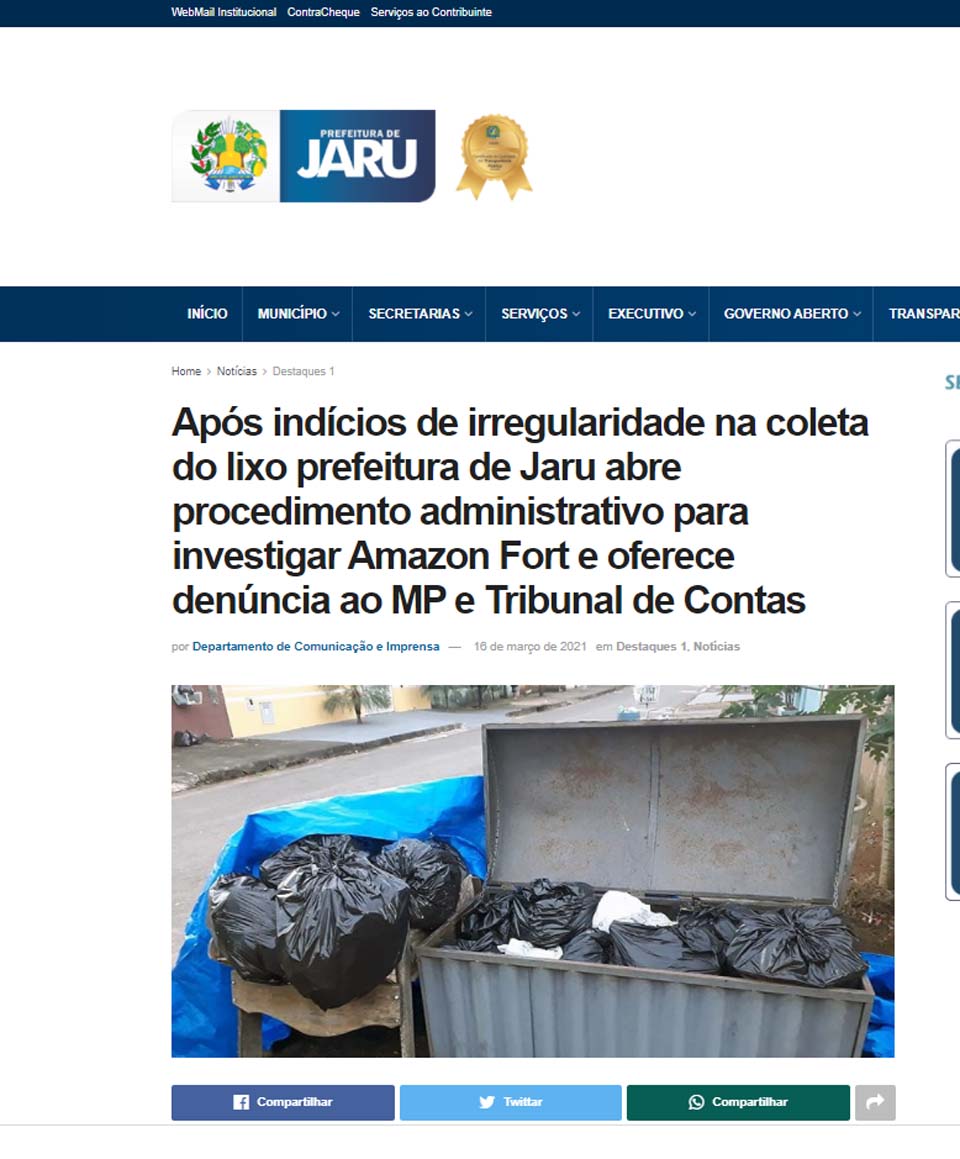 “A empresa Amazon Fort, responsável pela coleta do lixo urbano na sede do município e distritos de Bom Jesus, Santa Cruz e Tarilândia, foi notificada pela prefeitura para apresentar a defesa em tempo hábil, porém não conseguiu justificar as irregularidades identificadas”, diz a veiculação oficial (acesse clicando aqui).