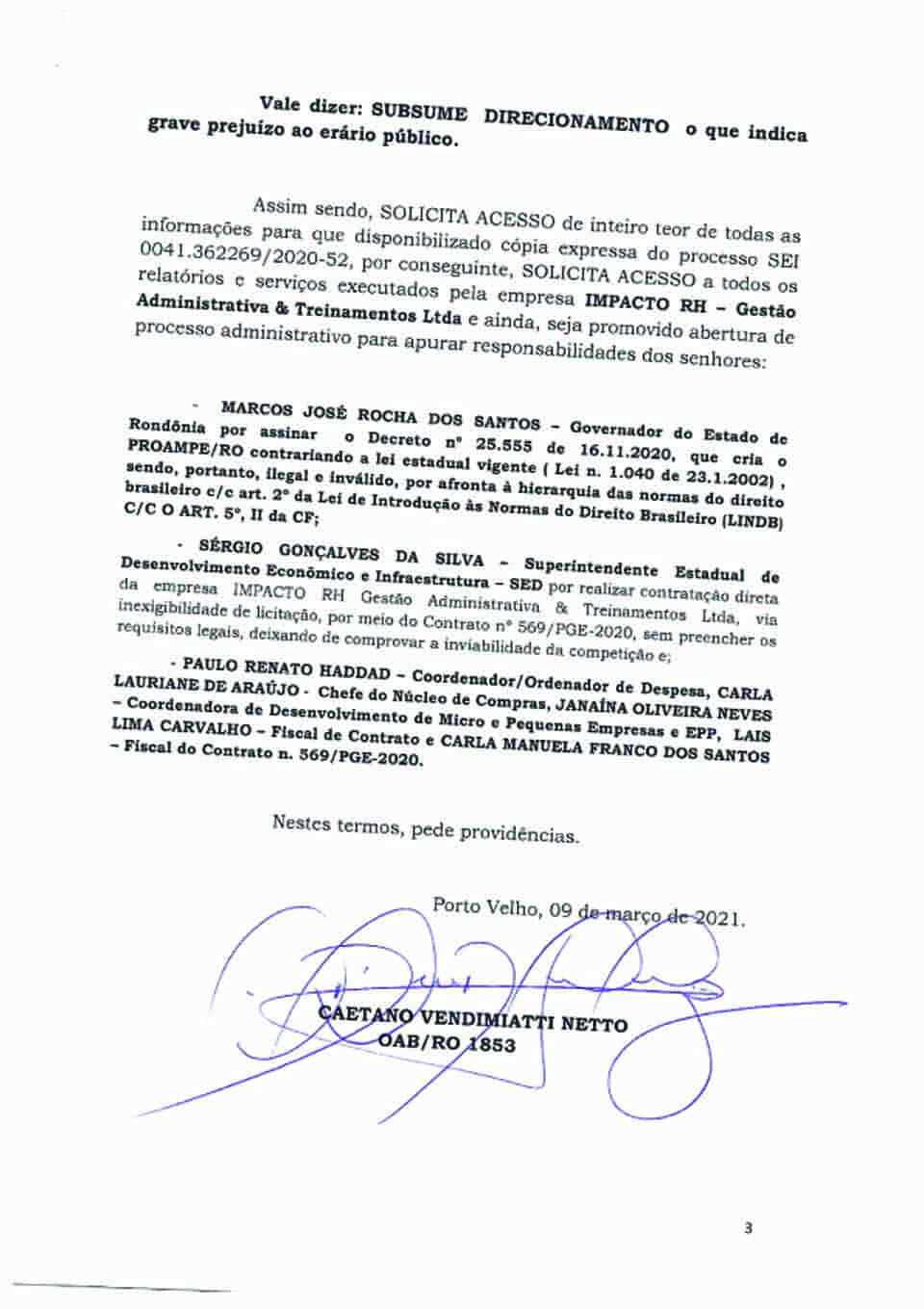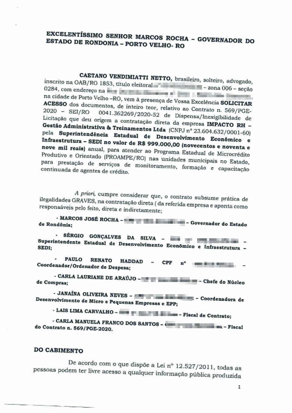 Porto Velho, RO – O advogado Caetano Vendimiatti Netto protocolou pedido de acesso a informações diretamente endereçado ao próprio governador Coronel Marcos Rocha, sem partido.