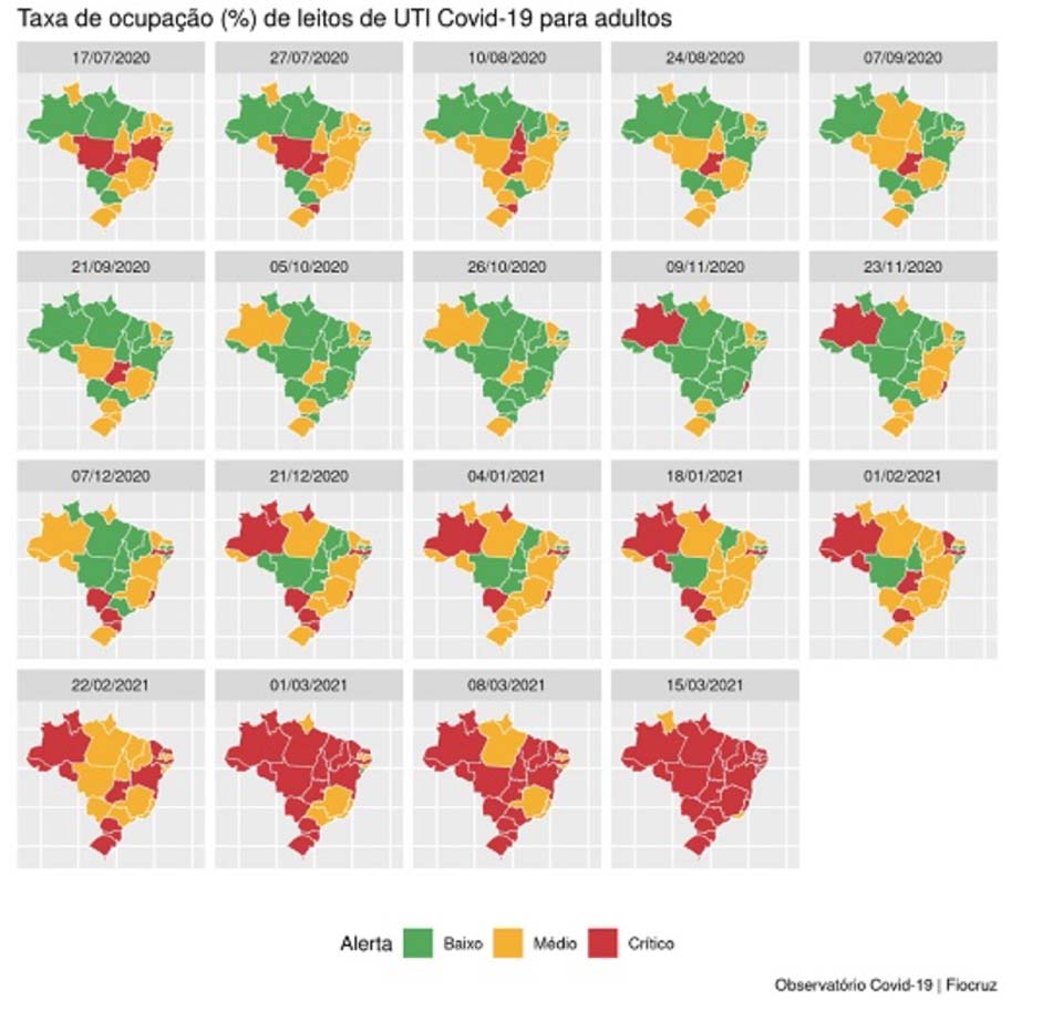 “O Boletim mostra que, no momento, das 27 unidades federativas, 24 estados e o Distrito Federal estão com taxas de ocupação de leitos de UTI Covid-19 para adultos no Sistema Único de Saúde (SUS) iguais ou superiores a 80%, sendo 15 com taxas iguais ou superiores a 90%. Em relação às capitais, 25 das 27 estão com essas taxas iguais ou superiores a 80%, sendo 19 delas superiores a 90%”, relata o informático.