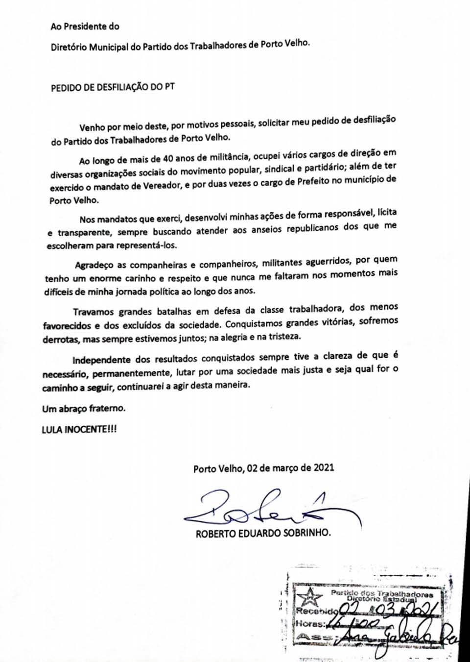 Porto Velho, RO – O Rondônia Dinâmica obteve em primeira mão um pedido formal apresentado pelo ex-prefeito de Porto Velho Roberto Sobrinho ao PT a fim de que a legenda o desvincule de seus quadros de filiados.
