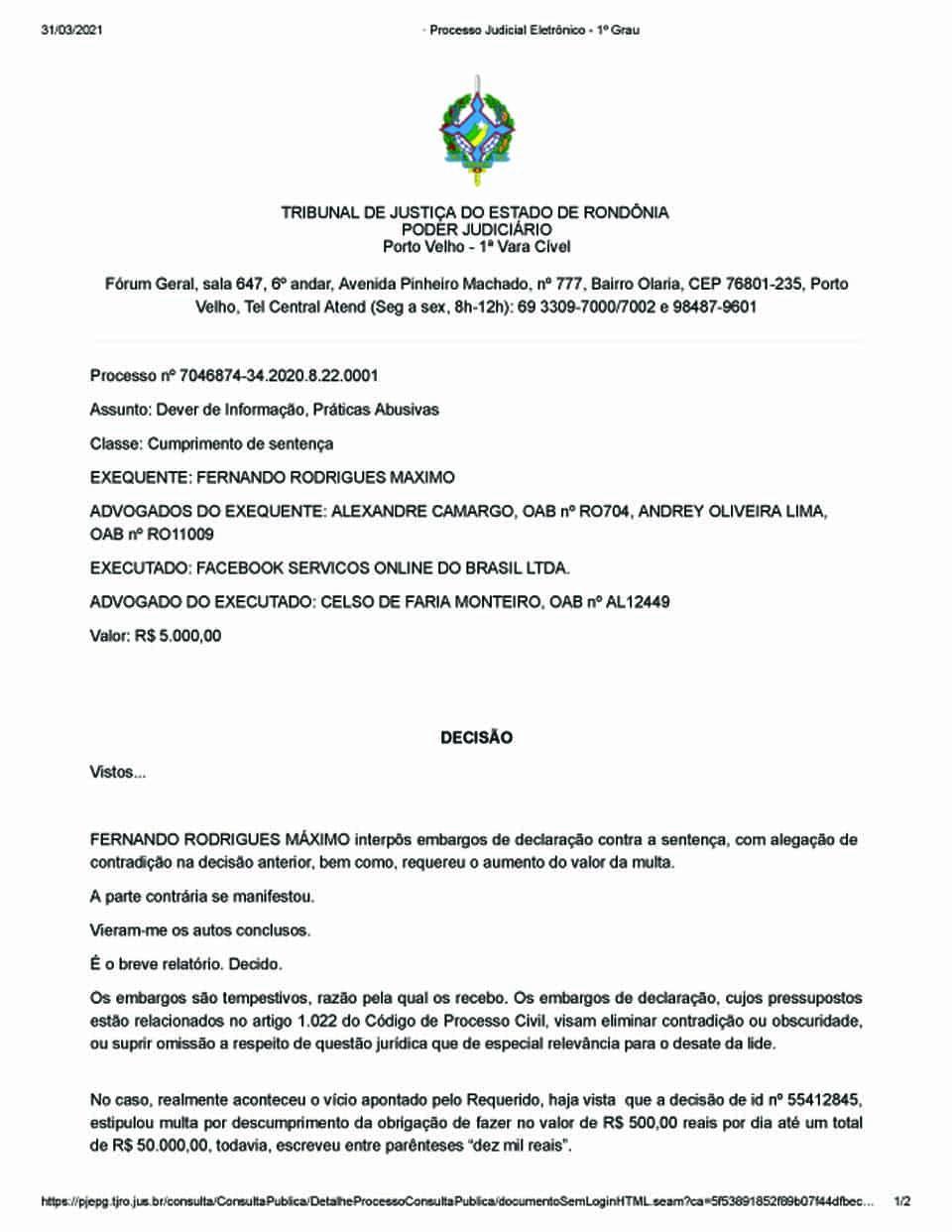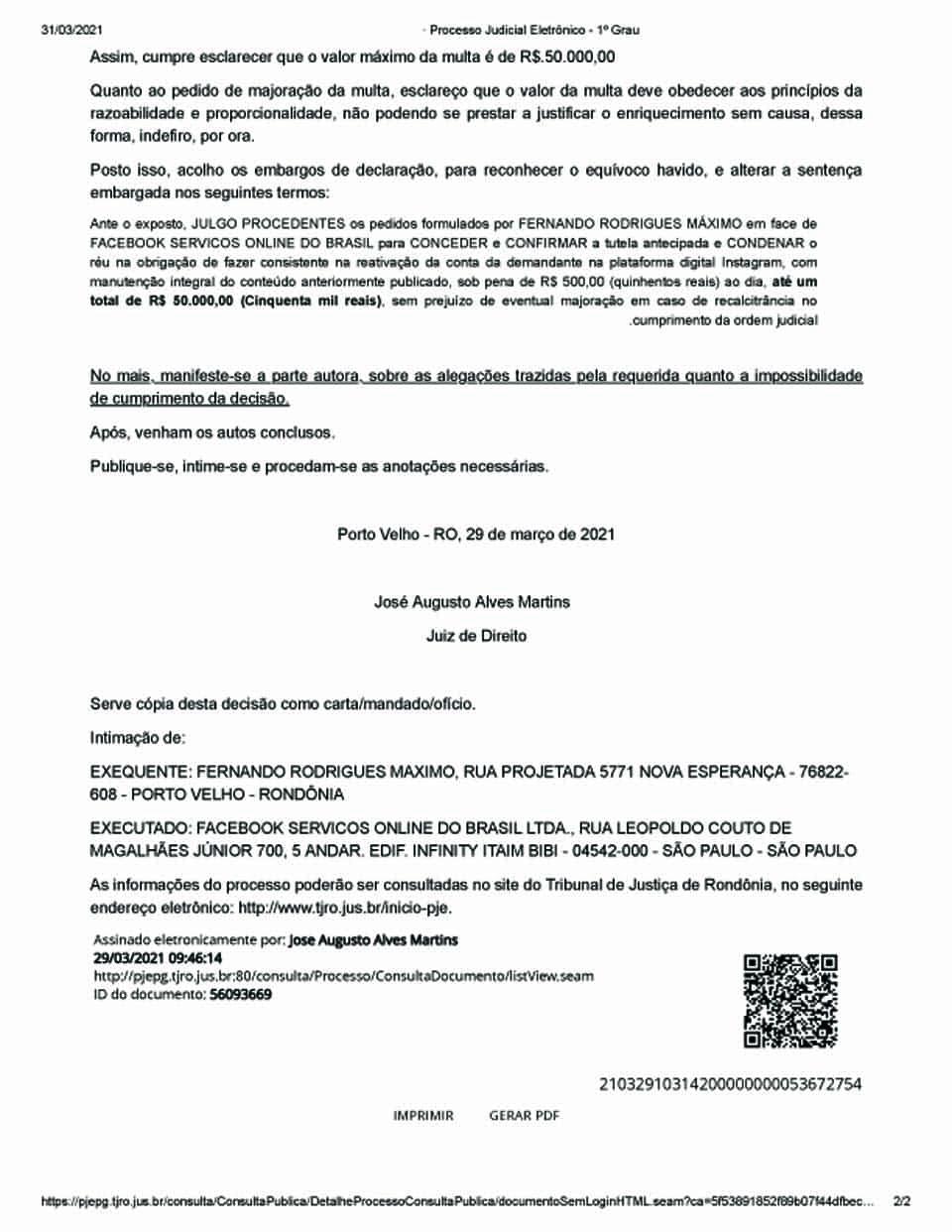 "Ante o exposto, JULGO PROCEDENTES os pedidos formulados por FERNANDO RODRIGUES MÁXIMO em face de FACEBOOK SERVICOS ONLINE DO BRASIL para CONCEDER e CONFIRMAR a tutela antecipada e CONDENAR o réu na obrigação de fazer consistente na reativação da conta da demandante na plataforma digital Instagram, com manutenção integral do conteúdo anteriormente publicado, sob pena de R$ 500,00 (quinhentos reais) ao dia, até um total de R$ 50.000,00 (Cinquenta mil reais), sem prejuízo de eventual majoração em caso de recalcitrância no cumprimento da ordem judicial", concluiu o magistrado José Augusto Alves Martins, da 1ª Vara Cível de Porto Velho.