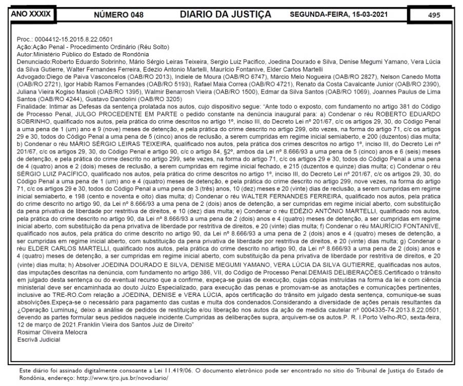 O juízo da 3ª Vara Criminal de Porto Velho condenou o ex-prefeito da capital, Roberto Sobrinho, e outros mandatários da Empresa Municipal de Desenvolvimento Urbano, por uma série de irregularidades administrativas ocorridas na Emdur. Sobrinho foi condenado a cinco anos de detenção pelos crimes de responsabilidade e falsidade ideológica (oito vezes) no regime semiaberto e pagamento de multa. Cabe recurso da decisão.