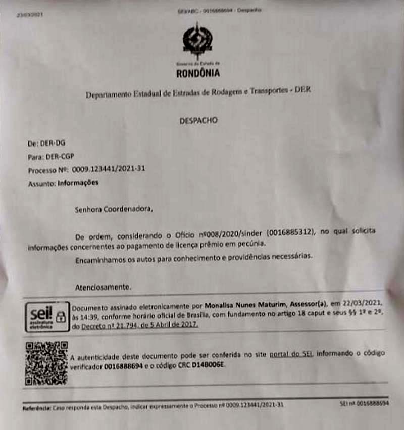 Muitos servidores já encaminharam ao DER-RO várias solicitações de pedido de pagamento de Licença prêmio em pecúnia, pois estão com a saúde debilitada ou tem familiares dependentes precisando de cuidados e também necessitam de tratamento de saúde, mas que segundo o presidente do SINDER, Ramon Sampaio, os pedidos veem se arrastando e sendo ignorados e deixados nas gavetas mofando por ingerência do Estado, enquanto trabalhadores e famílias sofrem sem nenhum auxilio e muitos deles morrem à mingua.