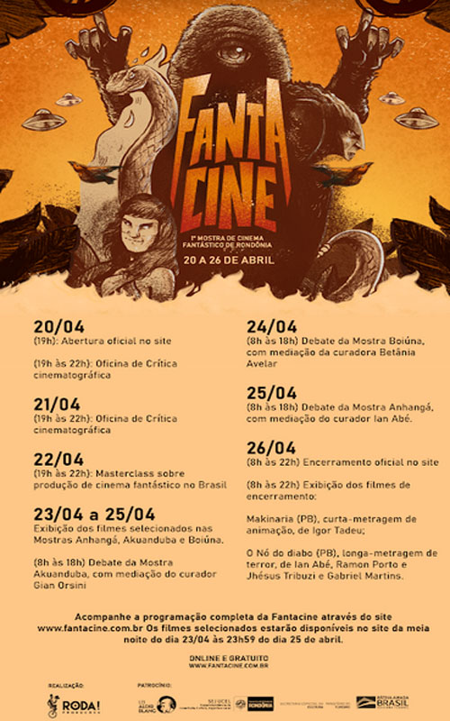 Começa nesta terça-feira (20/04) a programação online e gratuita que integra a 1a edição da Fantacine: Mostra de Cinema Fantástico de Rondônia, ofertando aexibição de26 filmes (curtas-metragens) distribuídos nas mostras temáticas Anhangá, Boiúna e Akuanduba; 3 debates; a realização deoficina de crítica cinematográfica e masterclass sobre produção de cinema fantástico no Brasil, além da exibição de dois filmes convidados em seu encerramento.
