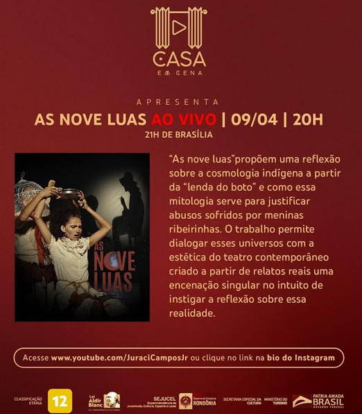 A programação especial do projeto Casa em Cena segue nesta sexta-feira (09), com a exibição do espetáculo As Nove Luas, da Cia de Artes Fiasco, de Porto Velho. Com transmissão no YouTube e Facebook a partir das 20h (horário local), a montagem traz uma reflexão sobre a lenda indígena do boto e os casos de abuso de meninas e mulheres na Amazônia.
