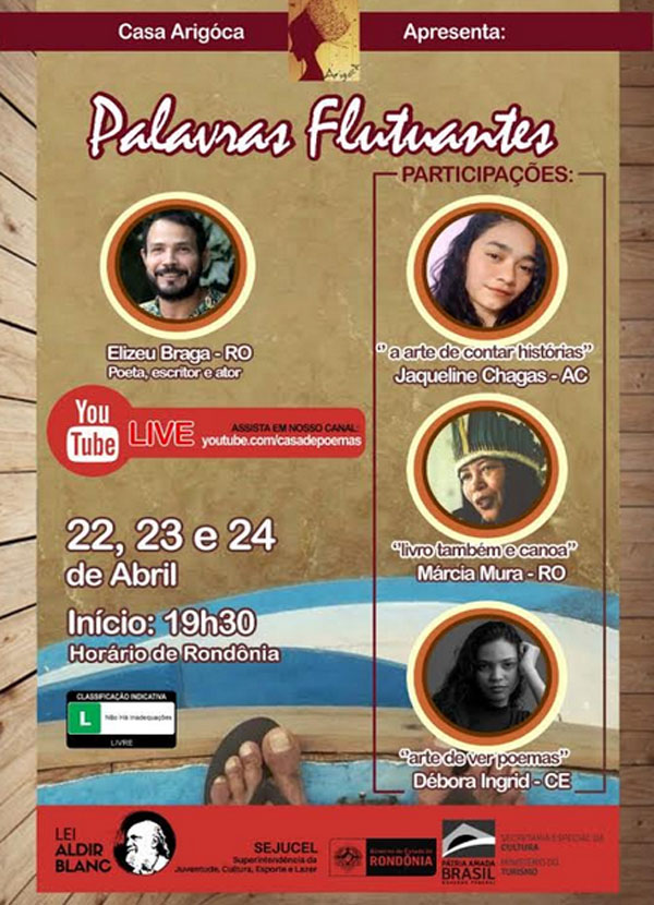 A 1ª Edição de “Palavras Flutuantes”, acontecerá nos dias 22, 23 e 24 de Abril de 2021, sempre às 19h30 (horário local), através do canal no Youtube da Casa de Leitura e Memória Arigóca. Esses diálogos poéticos onde cada conversa será um convite para navegar no universo das palavras, na escrita, na voz e atuação de 03 grandes artistas, que fazem da memória o ponto de partida para seus trabalhos artísticos.