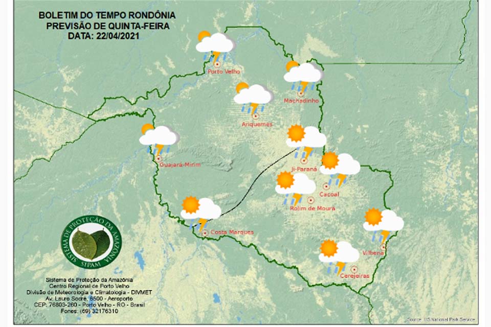 A previsão para este dia é de céu parcialmente nublado a nublado com pancadas isoladas de chuva e trovoadas no período da tarde na capital, no Vale do Jamari e no Vale do Guaporé.