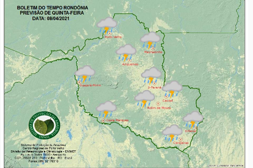 RONDÔNIA - A Divisão de Meteorologia do Sistema de Proteção da Amazônia informa que a quinta-feira será um dia de céu nublado em toda Rondônia.