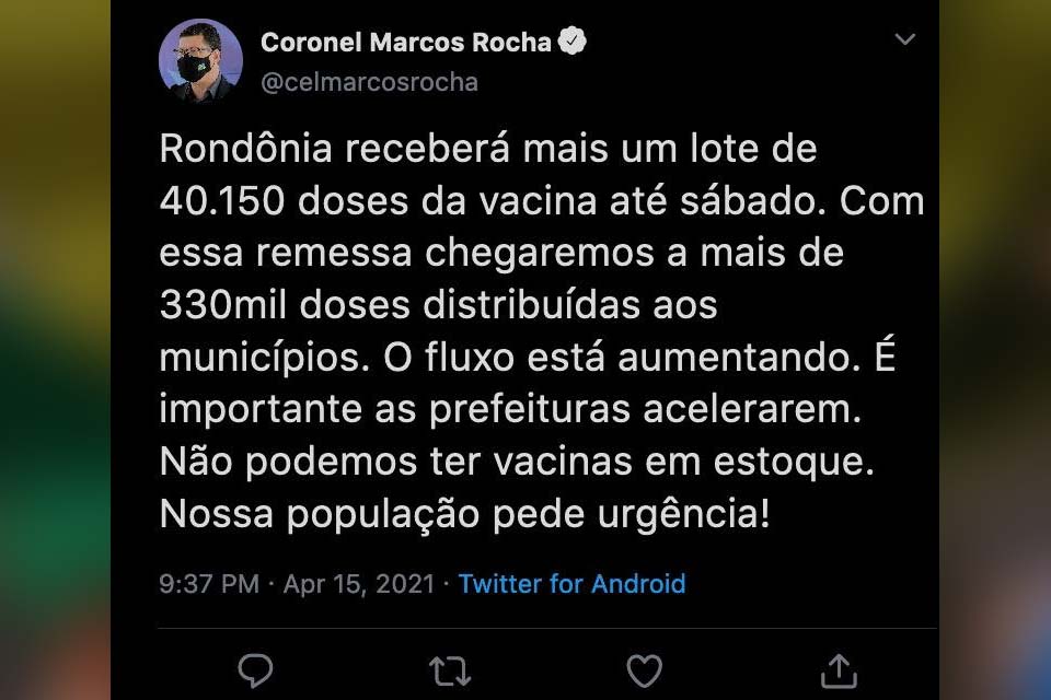 Foi o próprio governo federal que encaminhou dados ao líder da bancada rondoniense eviscerando oficialmente a discrepância entre os imunizantes recepcionados em cada cidade e os devidamente aplicados no povo.