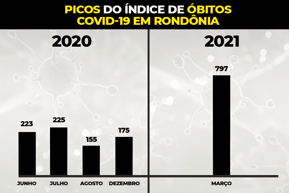 Embora o quantitativo seja alto, comparado a 2021, após completar um ano da primeira infecção de um cidadão rondoniense, apenas no mês de março, foram registrados 797 mortes de pessoas em decorrência da doença, consolidando-se até o momento o maior índice já registrado na história da pandemia no Estado. Ao todo, de acordo com a edição 382 do boletim diário, a região já soma: