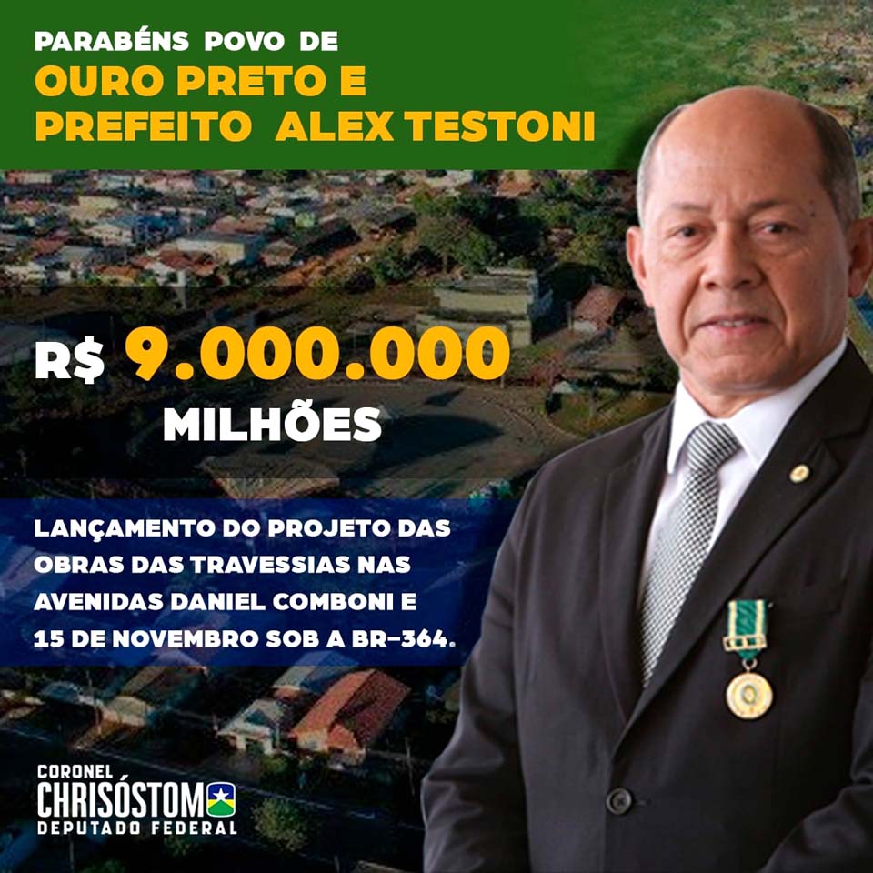 O Deputado Federal por Rondônia, coronel Chrisóstomo, usou sua rede social nesta quinta-feira (1º), para anunciar a destinação de R$ 9 milhões em recursos para serem aplicados na infraestrutura do município. Segundo o anúncio do parlamantar, os valores serão investidos principalemente na construção de dois viadutos sob a BR-364 nos cruzamentos das Avenidas Daniel Comboni e 15 de Novembro.