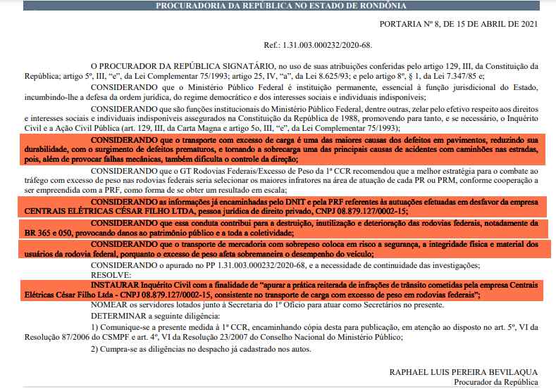 Porto Velho, RO – O procurador federal Raphael Luis Pereira Bevilaqua, membro do Ministério Público Federal de Rondônia (MPF/RO), determinou a deflagração de inquérito civil a fim de investigar a empresa Centrais Elétricas César Filho Ltda (Calcário Cesar Filho).