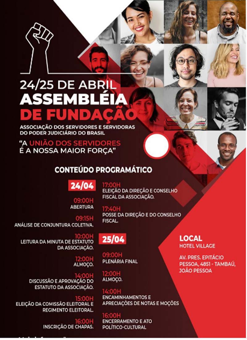 Nos dias 24 a 25 de abril, na cidade de João Pessoa, na Paraíba, acontecerá a Assembleia Geral de Fundação da ASJB – Associação dos Servidores do Judiciário Brasileiro, cuja entidade atuará em âmbito nacional.
