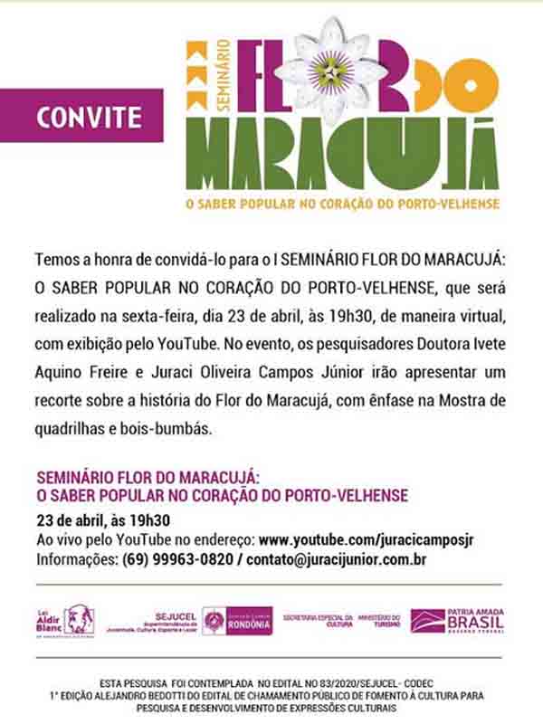 Acontece nesta sexta-feira (23) o primeiro Seminário Flor do Maracujá: o Saber Popular no Coração do Porto-velhense, realizado a partir de projeto de pesquisa homônimo realizado pelos pesquisadores Juraci Oliveira Campos Júnior e a professora Ivete de Aquino de Freire. O evento terá início às 19h30, com transmissão pelo YouTube, e trará o resultado de meses de um trabalho que integra relatos de organizadores, brincantes e outros tantos personagens importantes da construção da mais importante festividade cultural de Porto Velho.