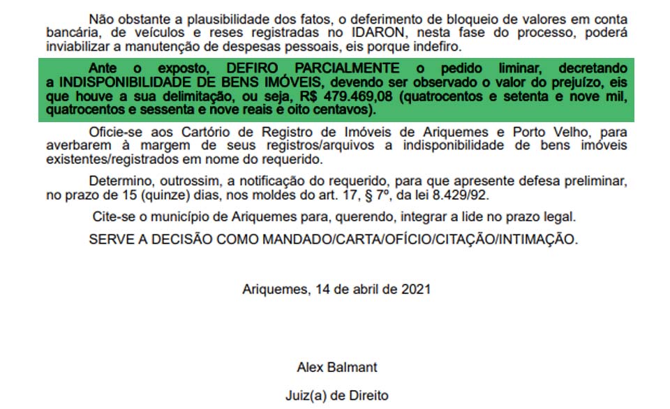 Porto Velho, RO – A Justiça de Rondônia determinou o bloqueio de quase meio milhão de reais em bens imóveis de um médico de Ariquemes.