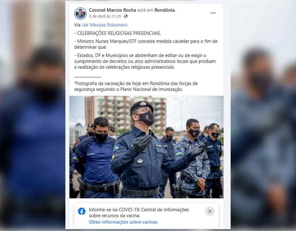 Porto Velho, RO – O governador de Rondônia Coronel Marcos Rocha, sem partido, reproduziu em seu Facebook postagem veiculada pelo presidente da República Jair Bolsonaro a respeito da decisão do ministro Nunes Marques, do Supremo (STF), sobre liberação de cultos em meio à pandemia.