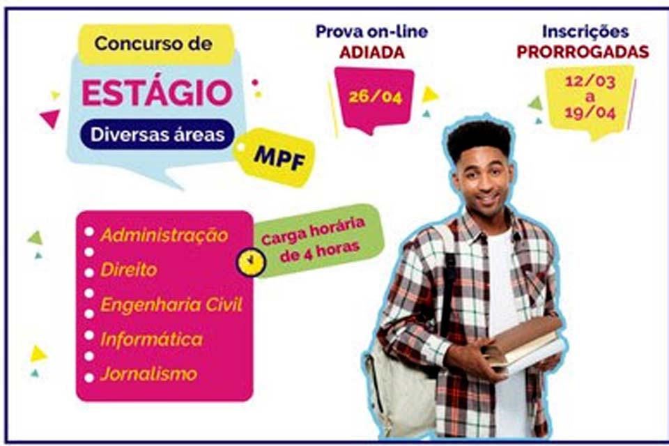 O Ministério Público Federal (MPF) alterou nesta quinta-feira (8) o edital para seleção de estagiários em cinco áreas: administração, direito, engenharia civil, jornalismo e informática. A nova data para a aplicação das provas é em 26 de abril. As inscrições iniciaram em 12 de março e vão até 19 de abril. A bolsa de estágio é de 850 reais e o auxílio-transporte é de sete reais por dia de estágio. A carga horária é de quatro horas diárias, de segunda a sexta-feira. As inscrições são gratuitas.