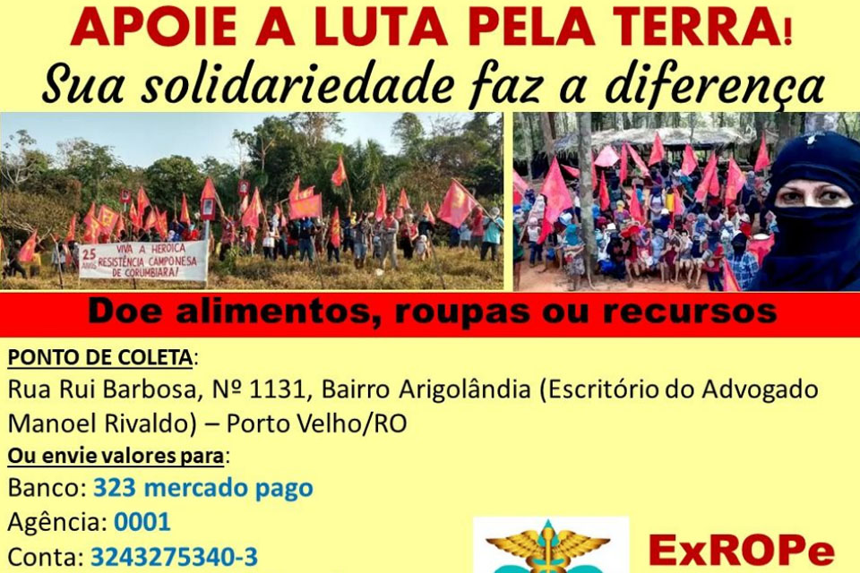 O Sintero está apoiando a campanha organizada pelos estudantes da Universidade Federal de Rondônia (UNIR), que visa arrecadar roupas, alimentos e recursos financeiros para ajudar os camponeses do Acampamento Manoel Ribeiro (Chupinguaia/Corumbiara) e o Acampamento Tiago dos Santos (Porto Velho).