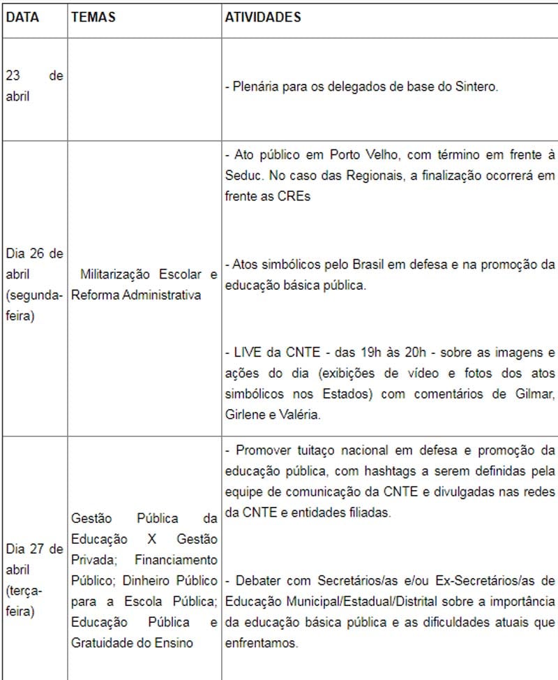 Na abertura nacional da 22º Semana Nacional em Defesa e Promoção da Educação Pública, que acontecerá no dia 26 de abril, o Sintero bem como sindicatos de todos os Estados farão um ato simbólico em defesa e pela promoção da Educação Básica Pública. Em Porto Velho, o Sintero convoca a categoria para participar de uma carreata com finalização em frente ao prédio da Secretaria de Estado da Educação (Seduc). No caso das Regionais, o ato será finalizado em frente às Coordenadorias Regionais de Educação (CREs). Os participantes devem permanecer durante todo o trajeto dentro de seus veículos, utilizando máscara e álcool, evitando assim, exposição ao coronavírus.
