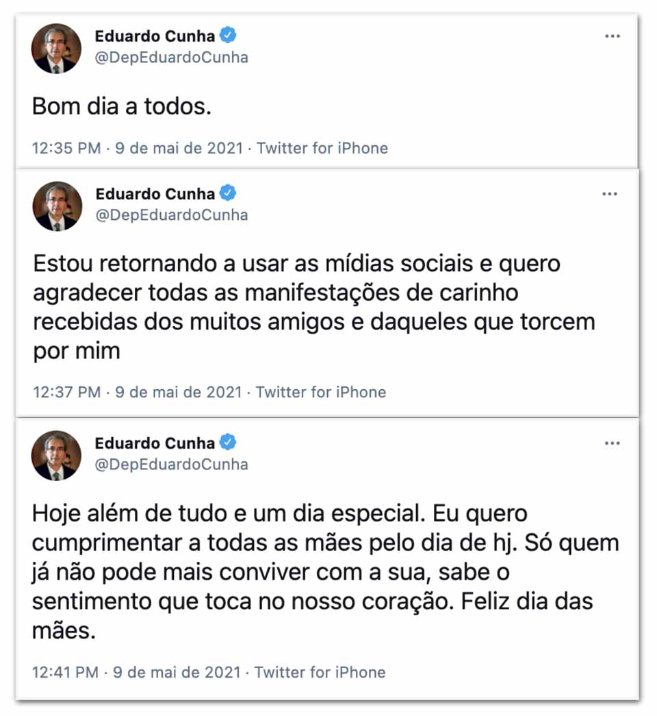 O ex-presidente da Câmara dos Deputados Eduardo Cunha voltou neste domingo (9.mai.2021) a fazer publicações no Twitter depois de ter a prisão domiciliar revogada por decisão do desembargador Ney Bello, do TRF-1 (Tribunal Regional Federal da 1ª Região).