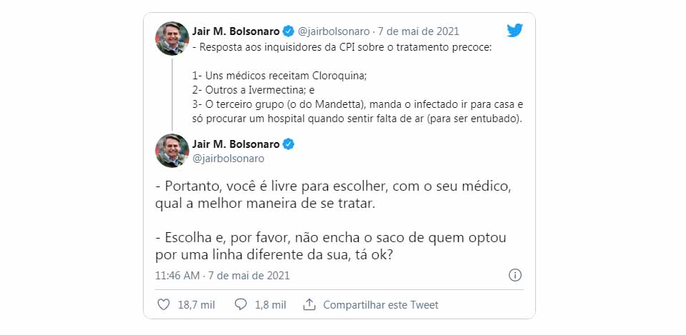 O presidente Jair Bolsonaro usou sua conta no Twitter, no início da tarde desta sexta-feira (7), para criticar os senadores da CPI da COVID-19 que rejeitam sua posição sobre o tratamento precoce contra o coronavírus.