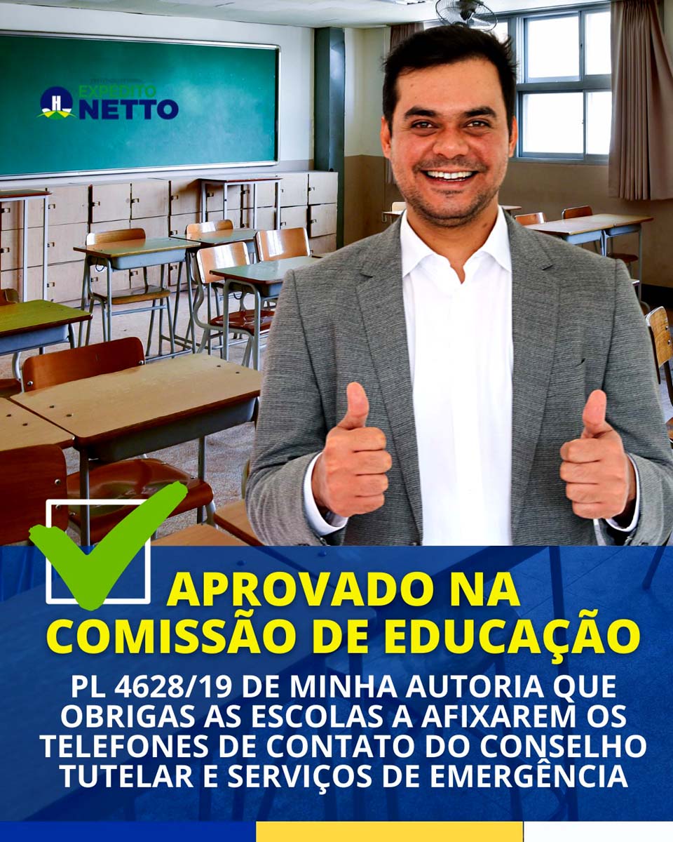 A Comissão de Educação da Câmara dos Deputados, aprovou o Projeto de Lei 4628/19, de autoria do Deputado Federal Expedito Netto, que obriga estabelecimentos de ensino a afixarem em suas instalações, em local visível e de fácil acesso, o número de telefone e os endereços, eletrônico e físico, do conselho tutelar local e também os números telefônicos de serviços públicos de emergência e de utilidade pública.