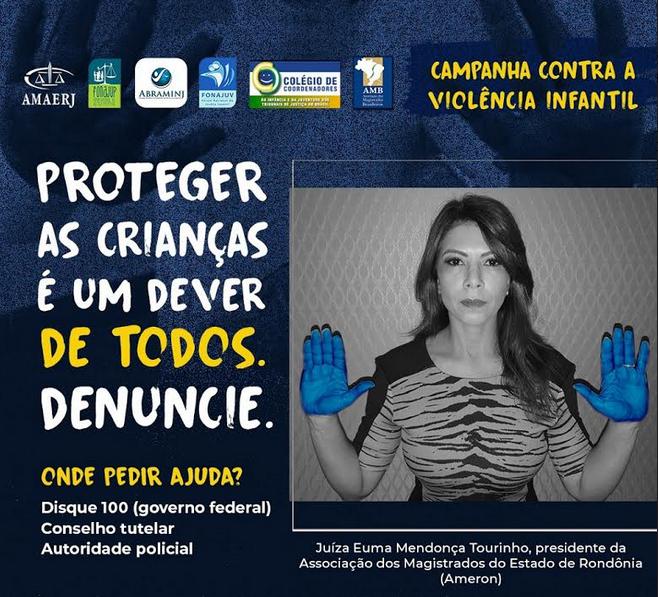 A Associação dos Magistrados do Estado de Rondônia (Ameron) prestou apoio a campanha de combate a violência infantil desenvolvida pela Associação dos Magistrados do Estado do Rio de Janeiro (Amaerj). A ação conta com o apoio de 14 Estados de todas as regiões do Brasil e o Distrito Federal, com a participação de magistrados, médicos, psicólogos, assistentes sociais, historiadores, biólogos, professores universitários, esportistas, advogados, serventuários e membros do Ministério Público.