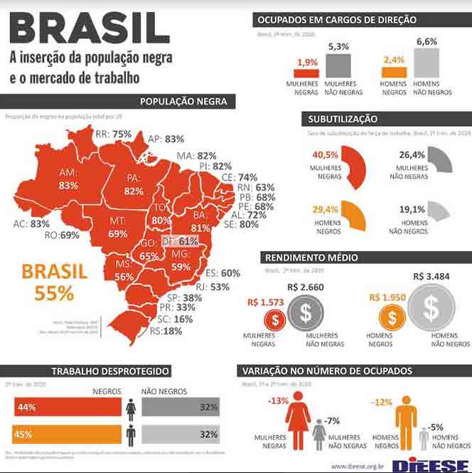 Já de acordo com o mais recente estudo do Dieese “A Inserção da População Negra no Mercado de Trabalho”, que teve como base a última PNAD Contínua (Pesquisa Nacional por Amostra de Domicílios Contínua, do IBGE), do segundo trimestre de 2020, as pessoas negras - em comparação a pessoas consideradas não negras - lideram os números do trabalho desprotegido, da subutilização e da variação de número de ocupados (com algum trabalho), mas perdem nos números de ocupação em cargos de direção e do rendimento médio. (gráfico abaixo)