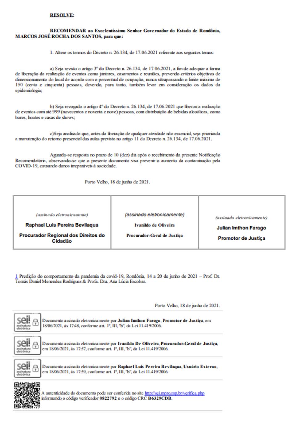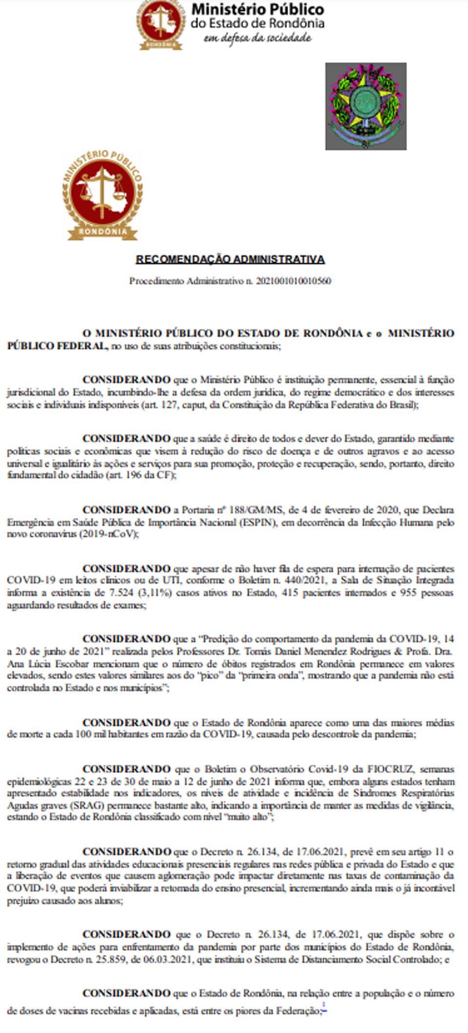 O Ministério Público de Rondônia (MP-RO) e o Ministério Público Federal (MPF) assinaram conjuntamente uma recomendação direcionada ao Governo do Estado de Rondônia a fim de que o chefe do Excutivo estadual recue em relação à liberação de eventos de grande porte.