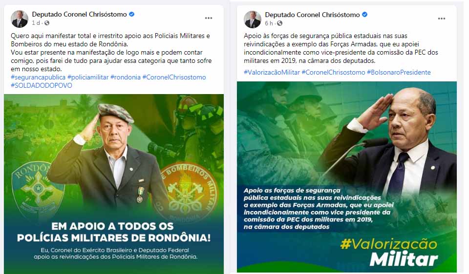 "Quero aqui manifestar total e irrestrito apoio aos Policiais Militares e Bombeiros do meu estado de Rondônia", postou o parlamentar em suas redes sociais.