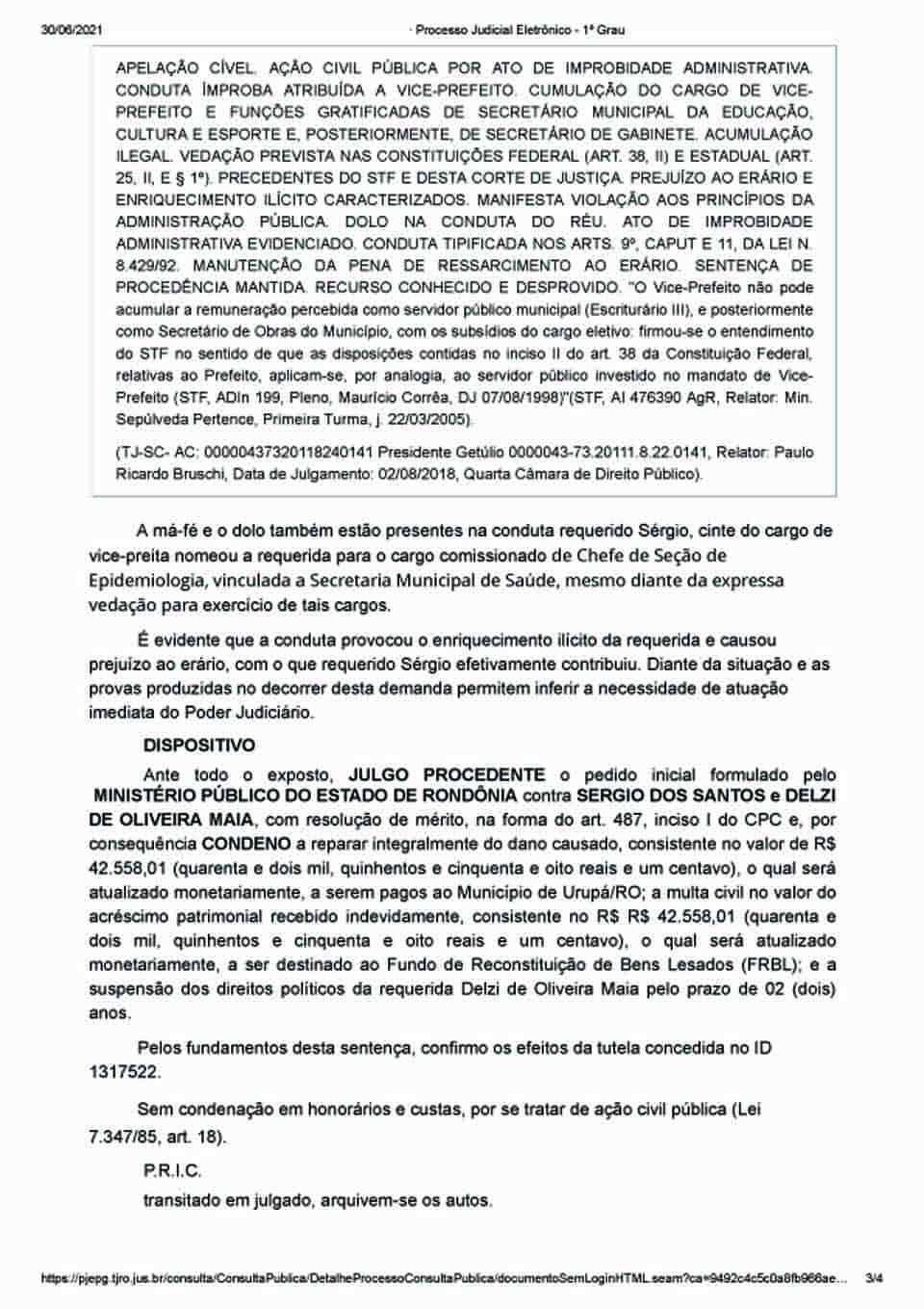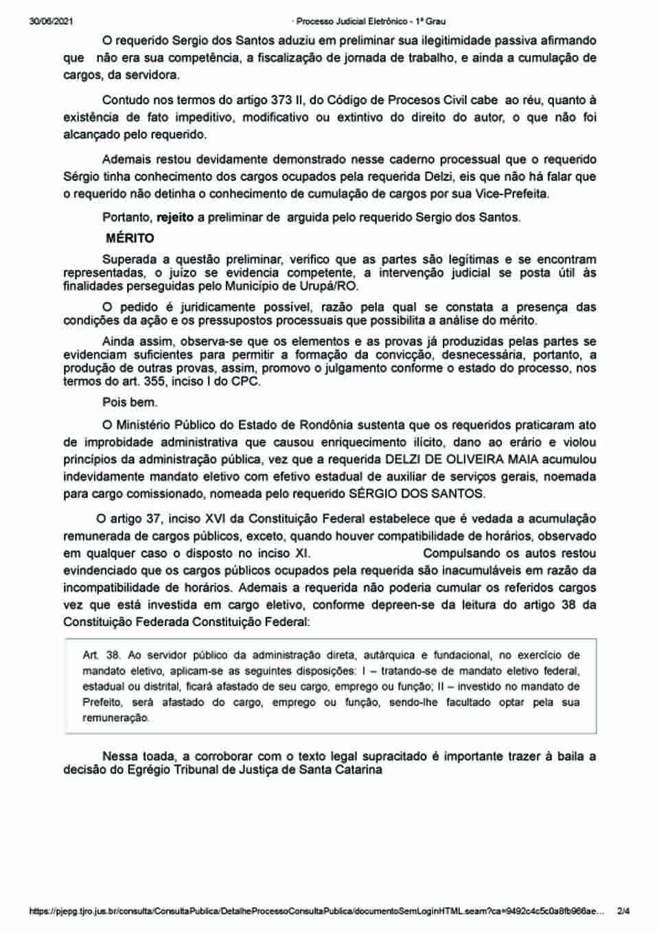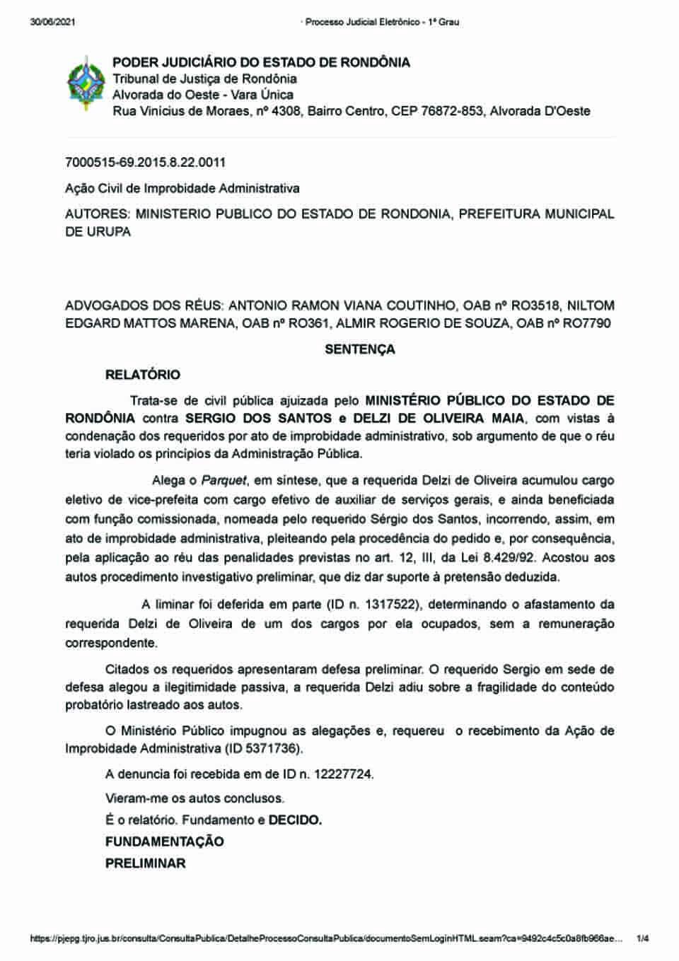 Em suma, fora alegado que Delzi de Oliveira acumulou cargo eletivo de vice-prefeita com função efetiva de auxiliar de serviços gerais do Estado e ofício comissionado, este último por nomeação patrocinada por Sérgio dos Santos. Com isso, ambos incorreram, ainda de acordo com o MP/RO, “em ato de improbidade administrativa”.