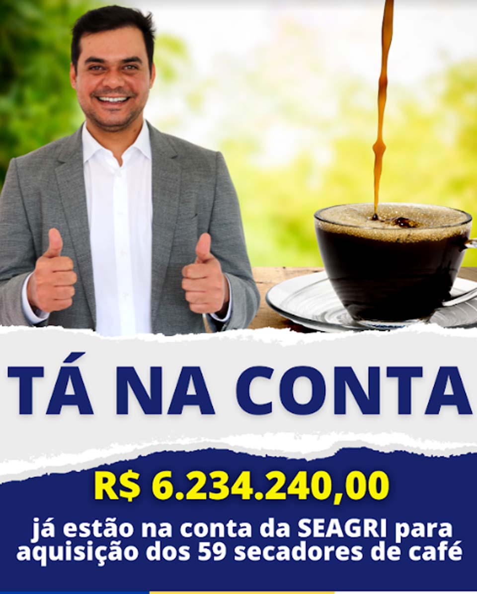 Na última sexta-feria (25), saiu a ordem bancária de pagamento, no valor de R$ 6.234.240,00, referentes a emenda do Deputado Expedito Netto para aquisição de 59 secadores de café. As instituições tiveram até o dia 14 de junho para se inscreverem no processo de chamamento público.