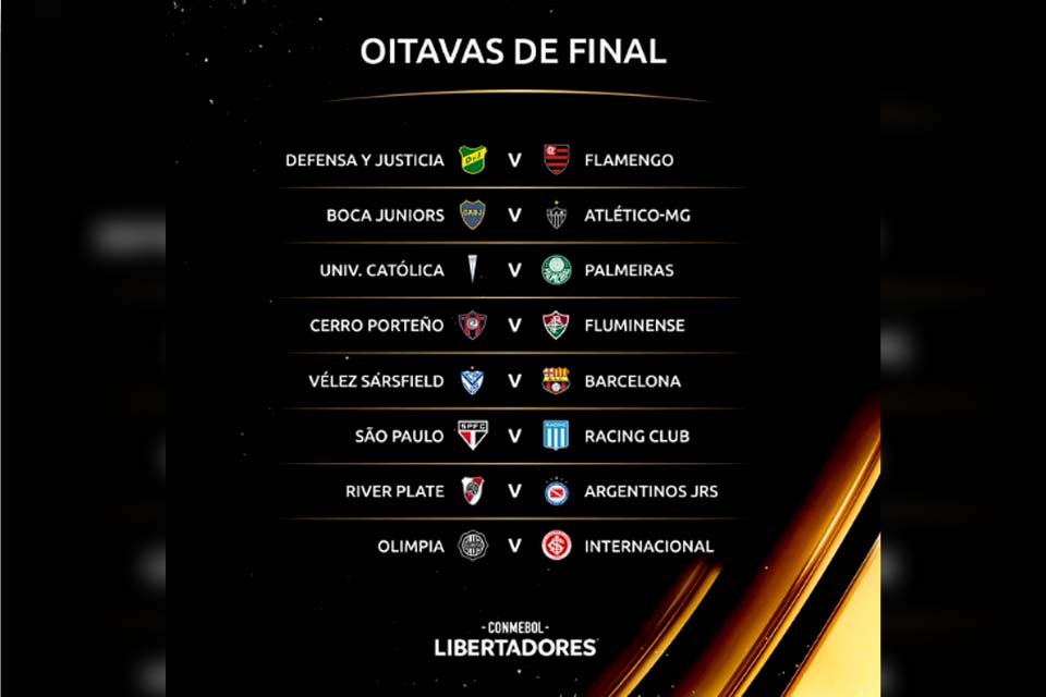 A Confederação Sul-Americana (Conmebol) sorteou nesta terça-feira (1° de junho) os confrontos pelas oitavas de final da Copa Libertadores, que serão disputados após a Copa América - que termina em 10 de julho. Atual campeão, o Palmeiras terá como adversário a Universidad Católica (Chile), com jogo de ida no estádio San Carlos de Apoquindo, na capital Santiago, e volta no Allianz Parque, em São Paulo. As datas e horários ainda será anunciados pela organização. O calendário da Libertadores prevê que as oitavas de final ocorram entre 13 e 22 de julho.