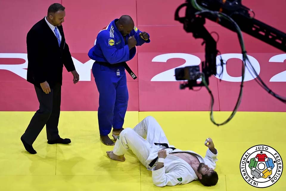 Dois anos depois, Jorge Fonseca entrou no tatame nesta sexta-feira com o back number vermelho e a responsabilidade de defender o título dos meio-pesados (100kg) no Mundial de Judô de Budapeste, na Hungria. E o português de 28 anos, que havia feito história em 2019, no Japão, ao sagrar-se o primeiro judoca lusitano campeão do mundo, repetiu a dose em grande estilo - assim como na comemoração. Mais uma vez, ele repetiu a dancinha apresentada ao mundo no Budokan, dois anos antes, dessa vez, logo após derrotar o sérvio Aleksandar Srbkukolj na final com um belo ippon.