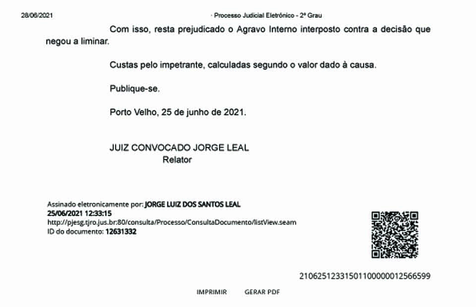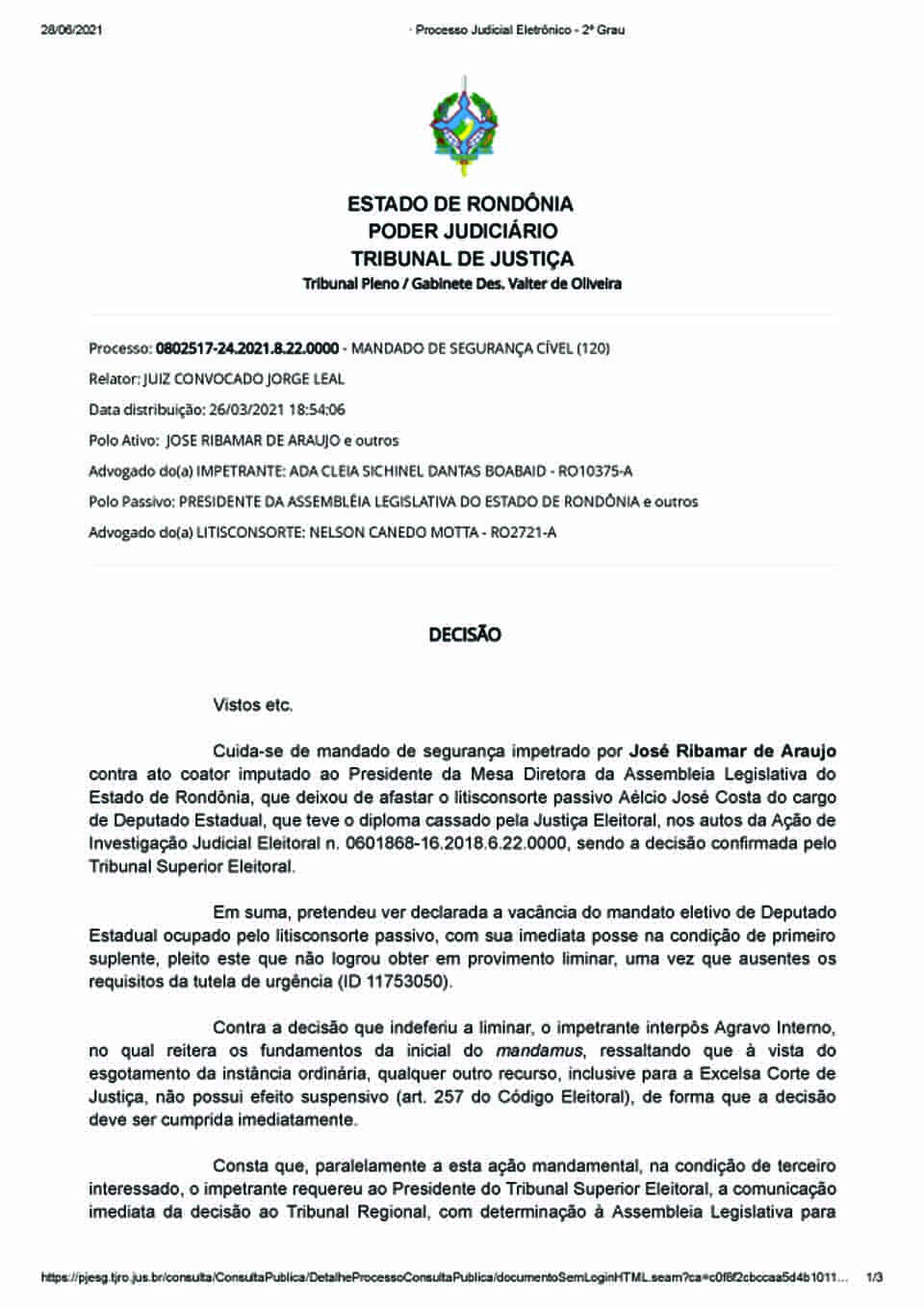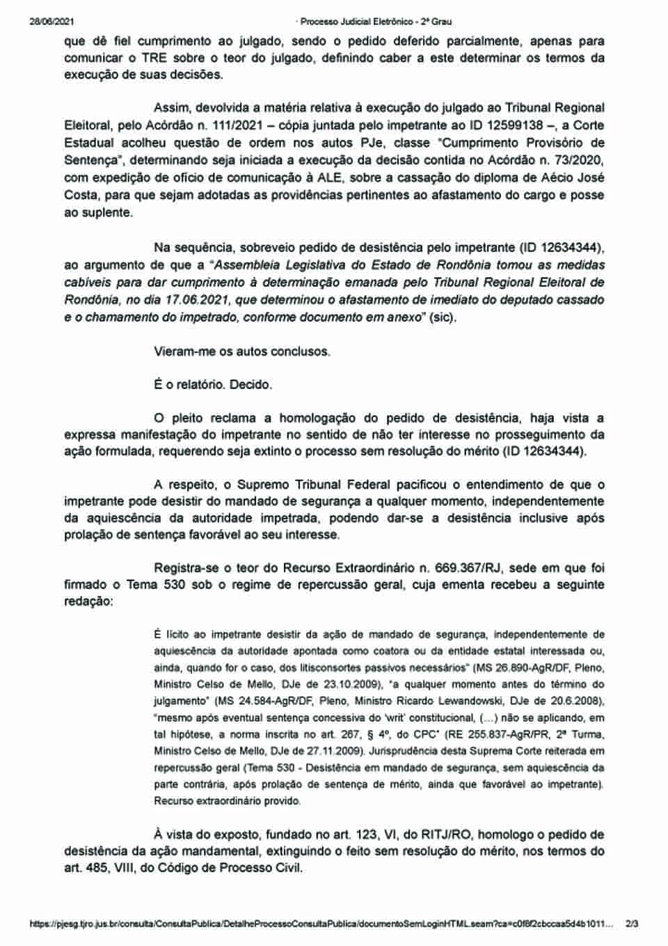 Araújo alegou na demanda que a “Assembleia Legislativa do Estado de Rondônia tomou as medidas cabíveis para dar cumprimento à determinação emanada pelo Tribunal Regional Eleitoral de Rondônia, no dia 17.06.2021, que determinou o afastamento de imediato do deputado cassado e o chamamento do impetrado”.
