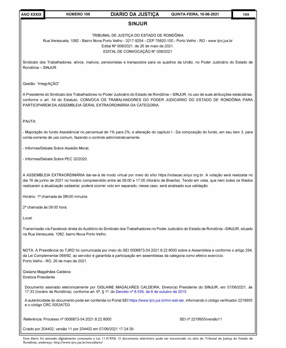 SINJUR - Edital de Convocação n° 008/2021