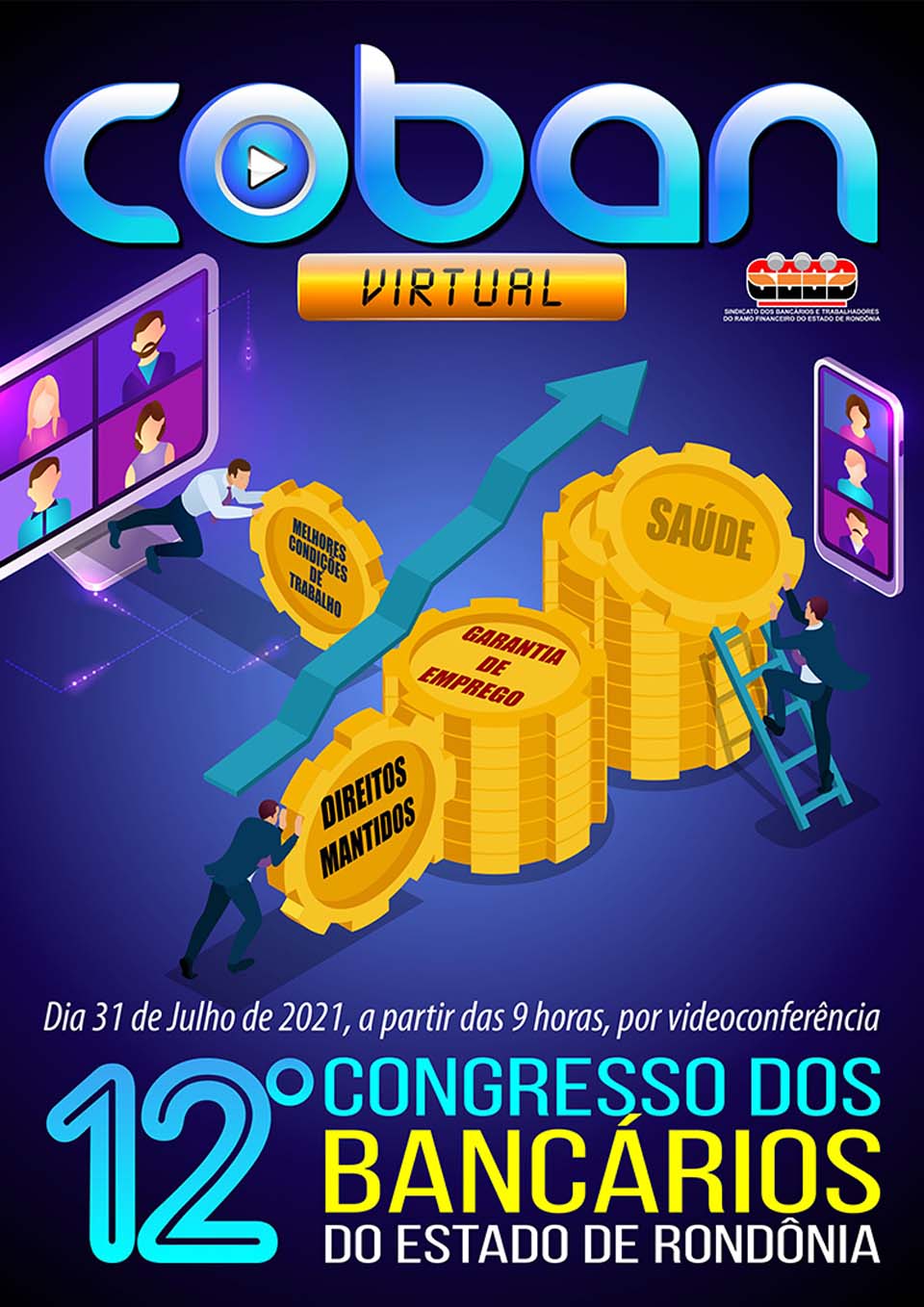 A 12ª edição do Congresso Estadual dos Bancários de Rondônia (COBAN) vai acontecer no dia 31 de julho, a partir das 9 horas e, a exemplo do ano passado, novamente será no formato virtual, pela plataforma Zoom.