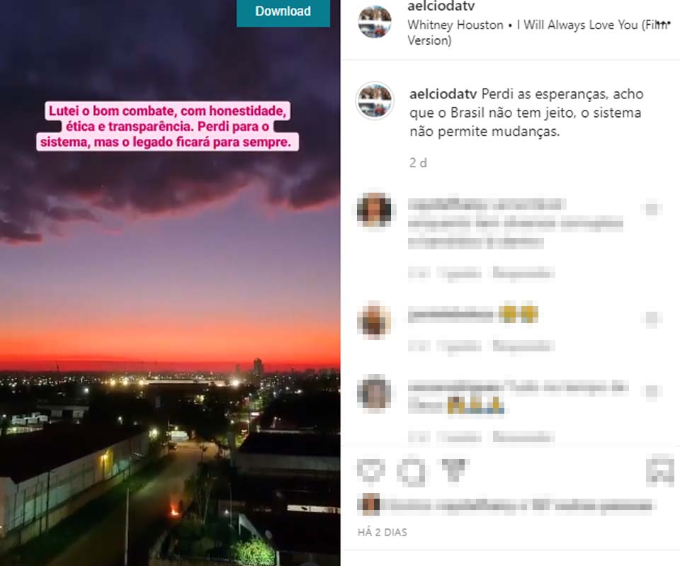 O vídeo-desabafo de Aélcio da TV foi publicado originalmente no último sábado, 03, mas republicado pelo deputado em seus stories nesta terça-feira (06) reforçando seu descrédito sobre o que chama de “sistema”.