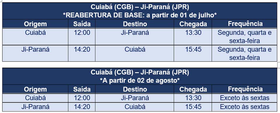 Inicialmente, serão três frequências semanais - às segundas, quartas e sextas - com destino à Cuiabá, capital do Mato Grosso, e, a partir de agosto, a previsão é de que sejam realizados seis voos por semana, de segunda à domingo, exceto aos sábados. Os Clientes voarão a bordo das aeronaves Embraer 195 E1, com capacidade para 118 lugares. Da capital mato-grossense, os Clientes poderão chegar a diversos destinos, como Rio de Janeiro, Brasília, Campo Grande, Porto Velho, Guarulhos e Campinas, em São Paulo, além de destinos no próprio estado do Mato Grosso com a Azul e Azul Conecta, como Alta Floresta, Sorriso, Sinop, Juína, Água Boa e São Felix do Araguaia. As passagens para os voos, que seguirão os protocolos sanitários adotados pela empresa desde o início da pandemia, estarão disponíveis para compra em todos os canais oficiais da Azul.