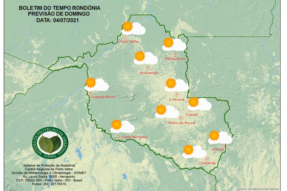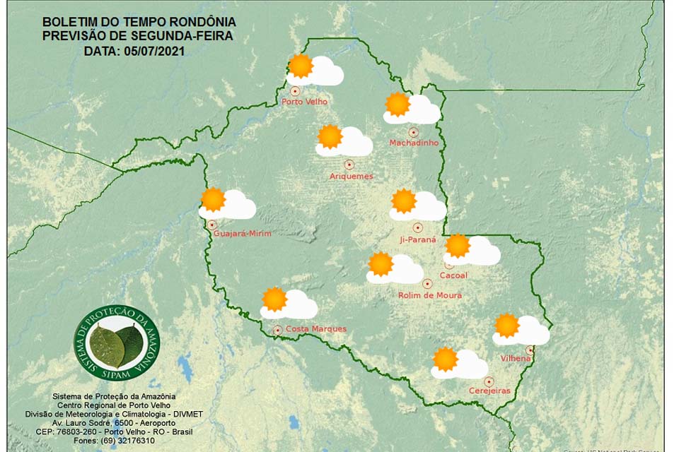 A Divisão de Meteorologia do Sistema de Proteção da Amazônia informa que a semana começa sem muitas alterações no tempo em Rondônia. Para esta segunda-feira, a previsão é de mais um dia ensolarado, de céu claro a parcialmente nublado e sem previsão de chuva em todas as regiões do estado. A umidade segue baixa, com valores próximos aos 30% em todo o estado no período da tarde.