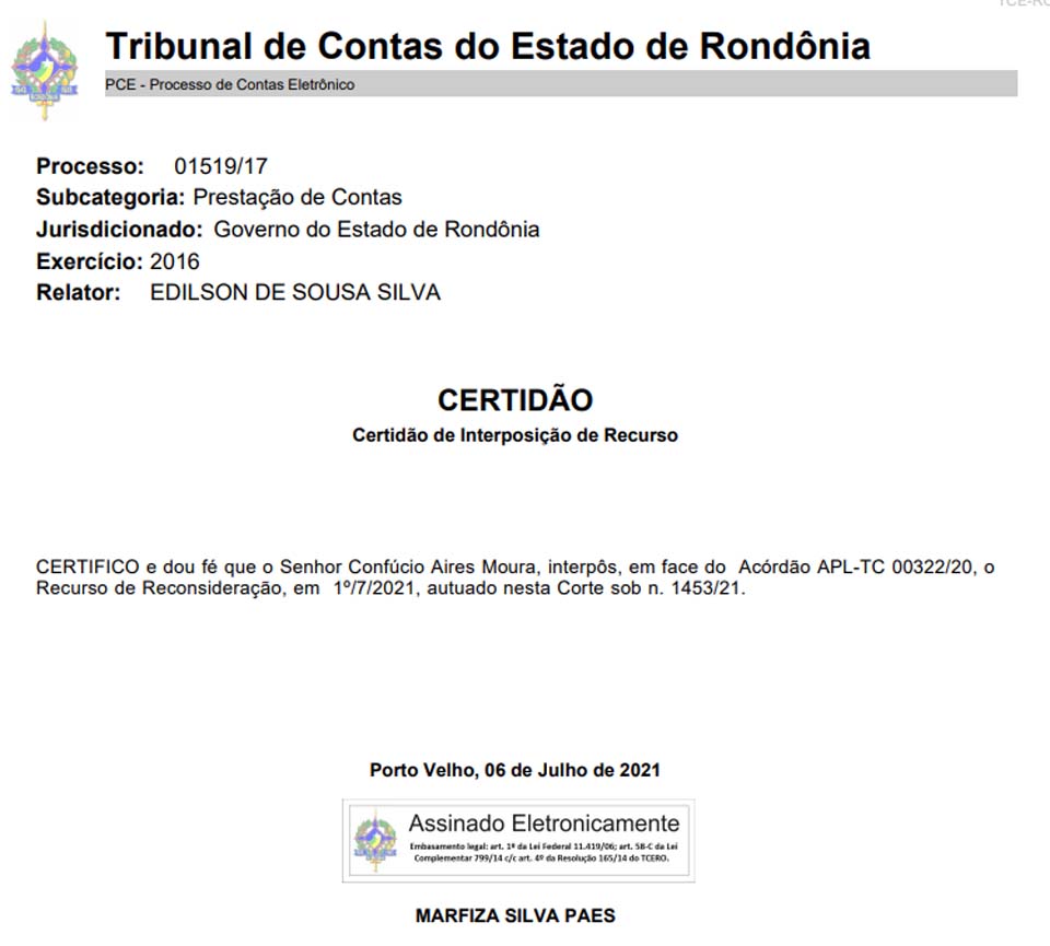 Porto Velho, RO – No dia 16 de junho deste ano o Rondônia Dinâmica veiculou matéria intitulada “Tribunal de Contas do Estado de Rondônia mantém reprovação das contas de Confúcio Moura”.