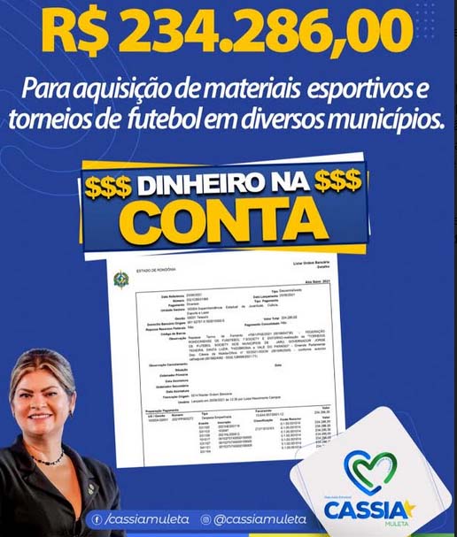 A Deputada Estadual Cassia Muleta destinou emenda parlamentar, que ja encontra-se com o valor em conta, de R$ 234.286,00 para aquisição de materiais esportivos e realização de torneios de futebol em Jaru, Vale do Paraíso, Theobroma, Santa Luzia e Governador Jorge Teixeira.