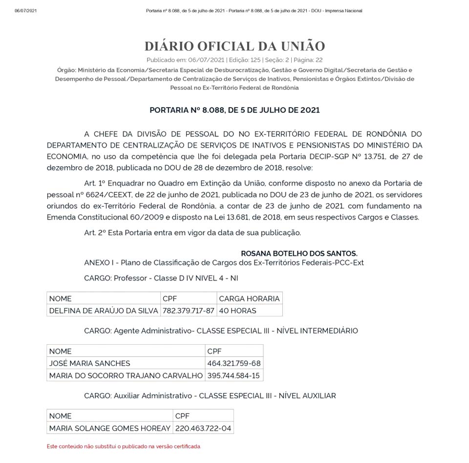 O Diário Oficial da União publicou nesta terça-feira (06/07), a Portaria nº 8.088/2021, enquadrando 04 servidores de Rondônia no quadro em extinção da União.