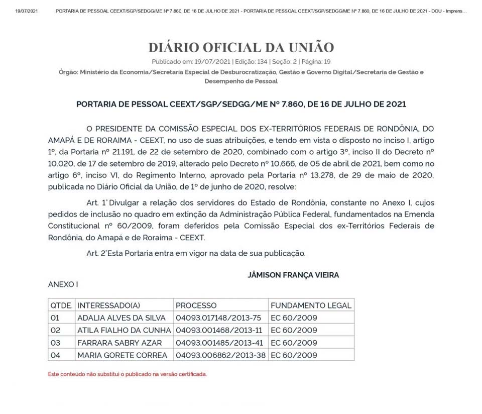 O Diário Oficial da União divulgou a Portaria de Pessoal nº 7.860/2021, beneficiando 04 servidores de Rondônia com a Transposição. O pedido desses servidores foi embasado na Emenda Constitucional nº 60/2009, conforme revela o documento. Após enquadramento, eles passarão a receber pela folha federal.