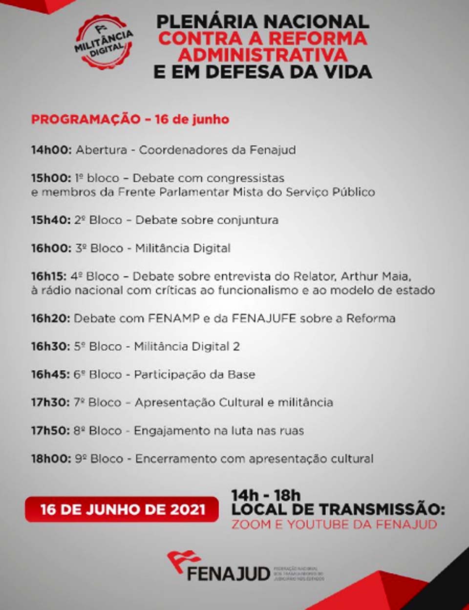 A Reforma Administrativa tem ganhado novos contornos no Congresso Nacional. A PEC (Proposta de Emenda à Constituição) 32/2020 que é extremamente prejudicial aos servidores e servidoras segue em tramitação na Comissão Especial. Diante de mais este ataque, a Fenajud (Federação Nacional dos Trabalhadores do Judiciário nos Estados) fará a Plenária Nacional contra a Reforma Administrativa e em Defesa da Vida, das 14h às 18h pelo Zoom e canal da Fenajud no YouTube.